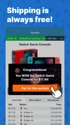 4. Win & Save Up to 99% - When no more bids are placed, the last bidder wins the auction. The winner gets the item for the discounted price and shipping is always FREE. Just like in a regular auction with no reserves, the excitement comes from the fact that any bid can be the last one!