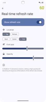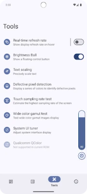 - Real-time refresh rate on hover (QS tiles support) - Brightness floating ball (QS tiles support) - Precise text scaling - Touch sampling rate test - Wide color gamut test - Ultra HDR test - Multitouch test - …