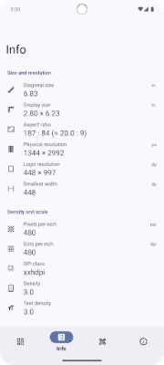 - Screen size - Physical & logic resolution - Pixel Density - Refresh rate - Touch sampling rate - Wide color gamut support - HDR support - Foldable screen state - Corner radius - Brightness adjustment level - …