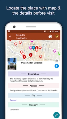 Apart from this, Ecuador Travel & Explore guides you Why, When and How to visit various places in Ecuador with precise location on the detailed Map. There are three ways to explore this app - Category view, City view and EduBank favorite places view. Pin your destinations and get the routes on the Map. Not only this, you can see exactly how the places look like with Street View integrated in this app. The app also has a feature to Rate and write Review/Experience regarding entity(s) through Login. Your Travel experience and rating will help the user community.