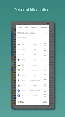 -> Filter by apps, processes, threads, tags, levels and messages