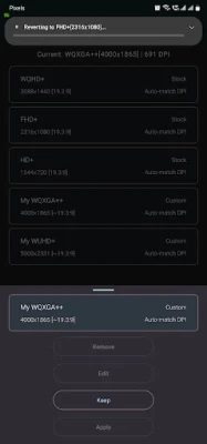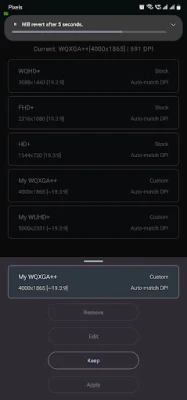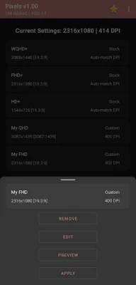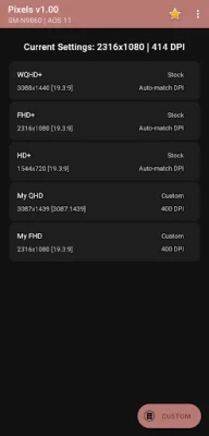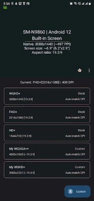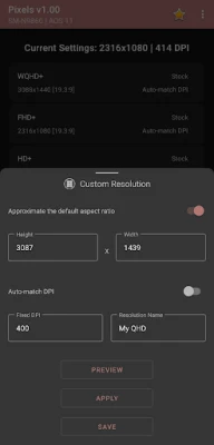 ✅ Easily TEST and/or APPLY your own custom display resolution and density (DPI) settings ✅ Can smartly compute the other side (height or width) of the display resolution based on the displays aspect ratio when you input on any one side (when the option is enabled) ✅ Can smartly compute the matching density (DPI) of the desired custom display resolution using some trigonometric computations (when the option is enabled) ✅ Smartly suggests the name of custom display resolution for adding to the presets ✅ Automatically reads the device's pre-defined screen resolution setting(s) so you can easily switch to it(them) when desired ✅ Option to reset display resolution and density values to default factory values ✅ Save multiple custom display resolution and density settings to the preconfigured list for easier use anytime (premium). Free user is limited to saving one custom resolution only.