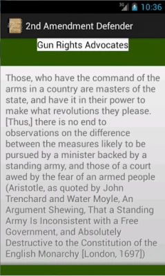 These citations have been collected from many 2nd Amendment related sources, and are now found here, in a single, easy to access smartphone app. This app can help anyone educate others about why the 2nd Amendment is important, and subsequently defend it. This is intended to be the absolute best app to help you defend the 2nd Amendment app available.
